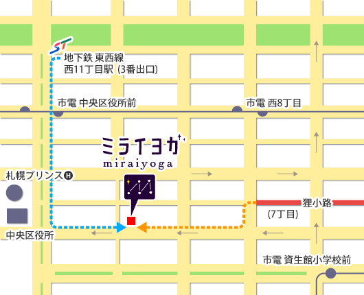 ミライヨガは、地下鉄西11丁目駅から徒歩で約6分、狸小路の端からは徒歩で4分ほどの距離。
